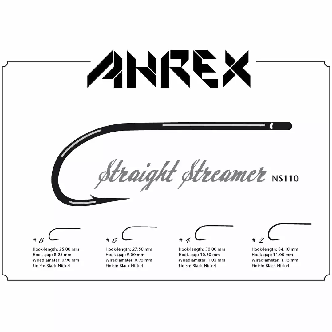 The Ahrex NS110 is a straight eye saltwater streamer hook manufactured from high-strength wire. Most classic saltwater streamer patterns will look beautiful on this hook, but it is also suited for large freshwater streamer patterns. This premium hook features a super sharp point and small barb to ensure effortless hook ups.