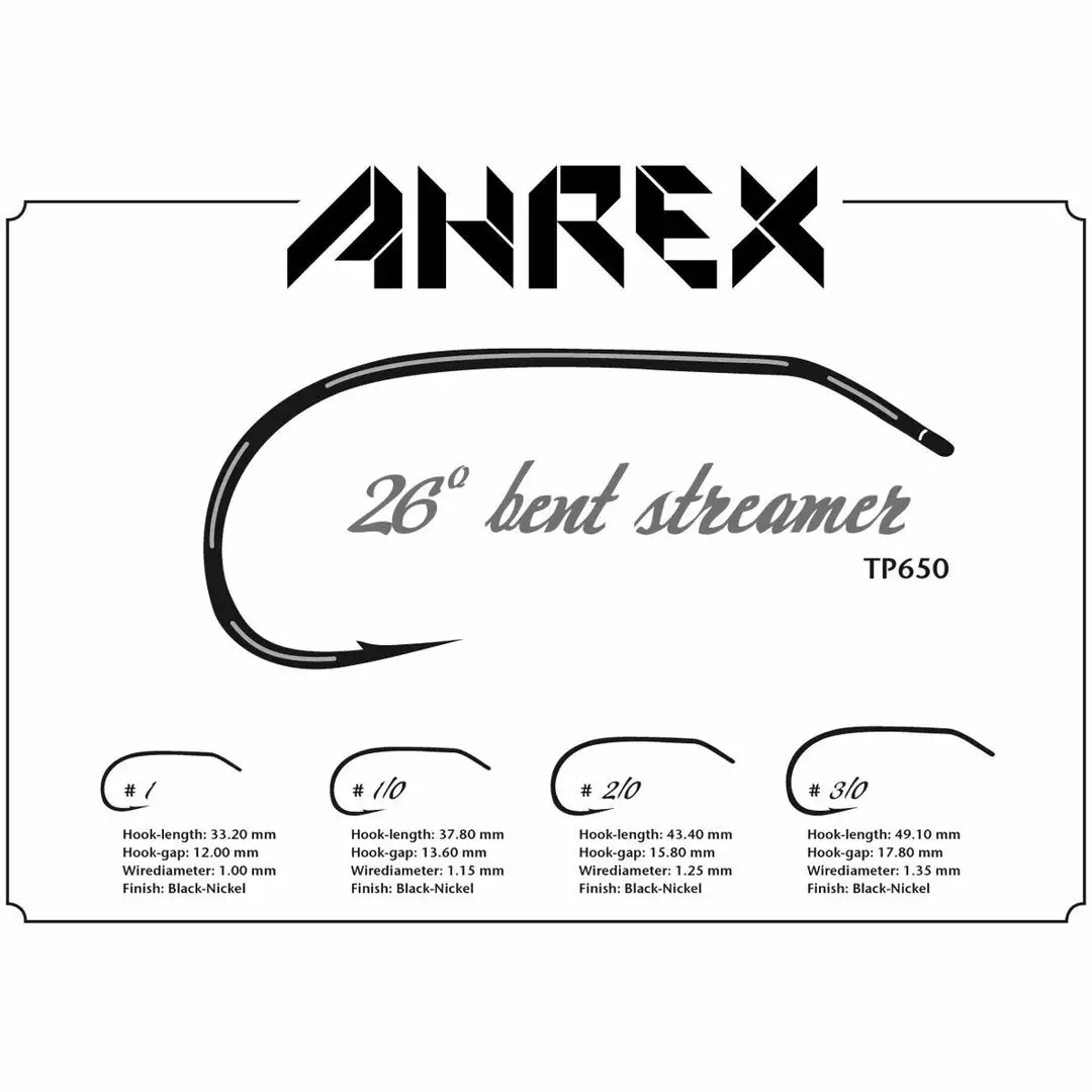The Ahrex TP650 26 degree bent streamer hook was designed with articulated streamer patterns in mind where an angled deer hair head, or otherwise, creates an irresistible movement. It features a large hook gape to accommodate bigger heads. When flipped upside down with dumbbell eyes or a sculpin helmet, this hook is also perfect for jig style patterns. Ahrex hooks are extremely sharp and made with the best materials and technology available.