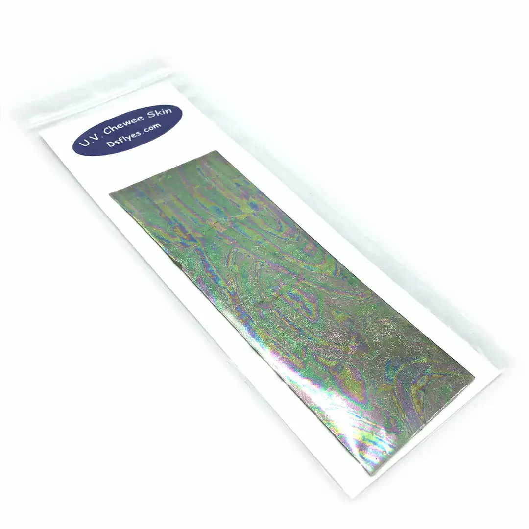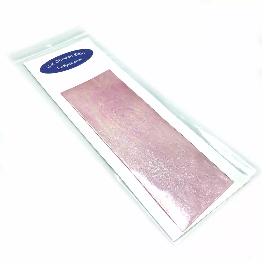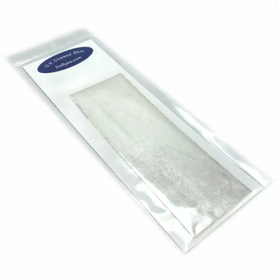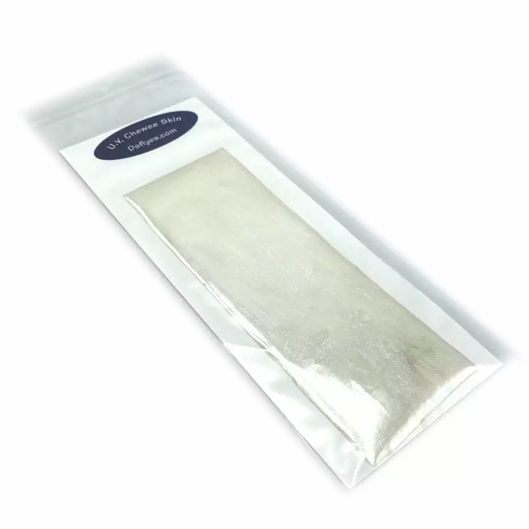 UV Chewee Skin is a pliable material that can be cut and shaped for many fly tying applications. Great for wing cases, bodies, ribs and more. This material wraps easily, has a natural sheen, and since it DOES NOT have an adhesive backing, it is extremely easy to use. The UV reflective qualities of Chewee Skin also make it more visible to trout, salmon, steelhead, and other game fish, even more so than fluorescent materials. UV Chewee skin has a multitude of uses at the fly tying bench and it’s a material that adds that little something that the fish just love. Cut it into strips, wrap it around the hook, and you have an easy and effective worm pattern. The possibilities are endless with this material, so have fun and get creative. Available in 19 fish-attracting UV colors!