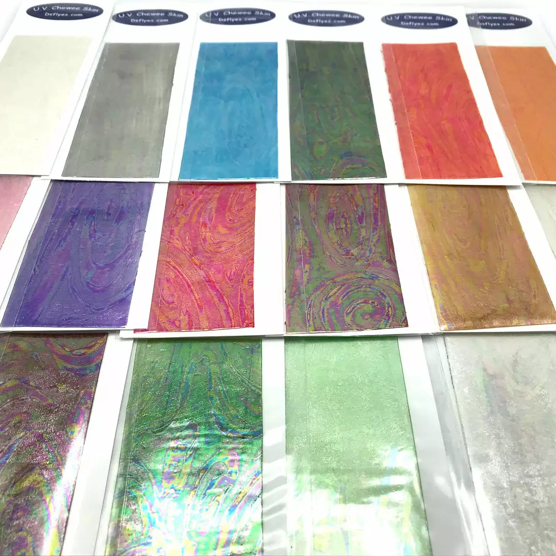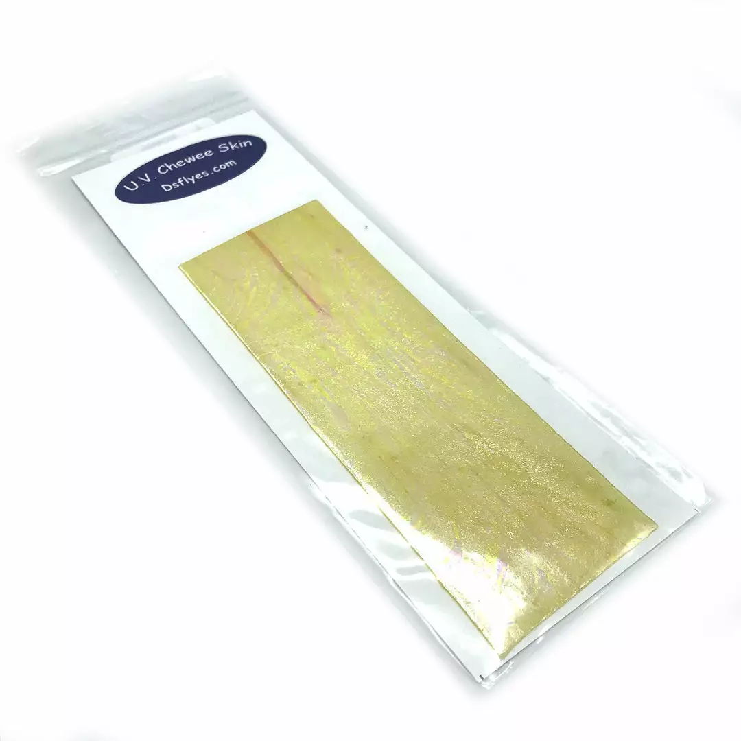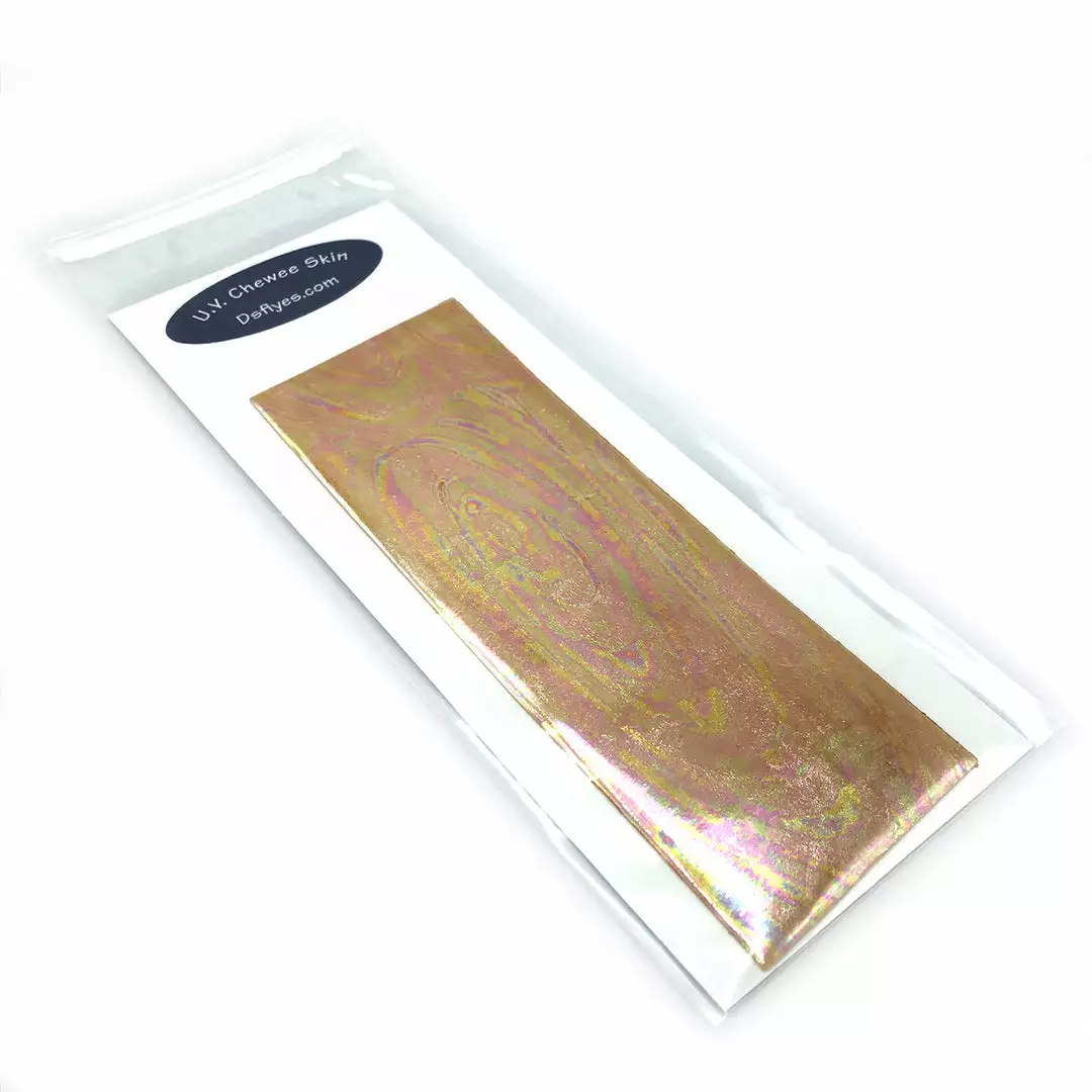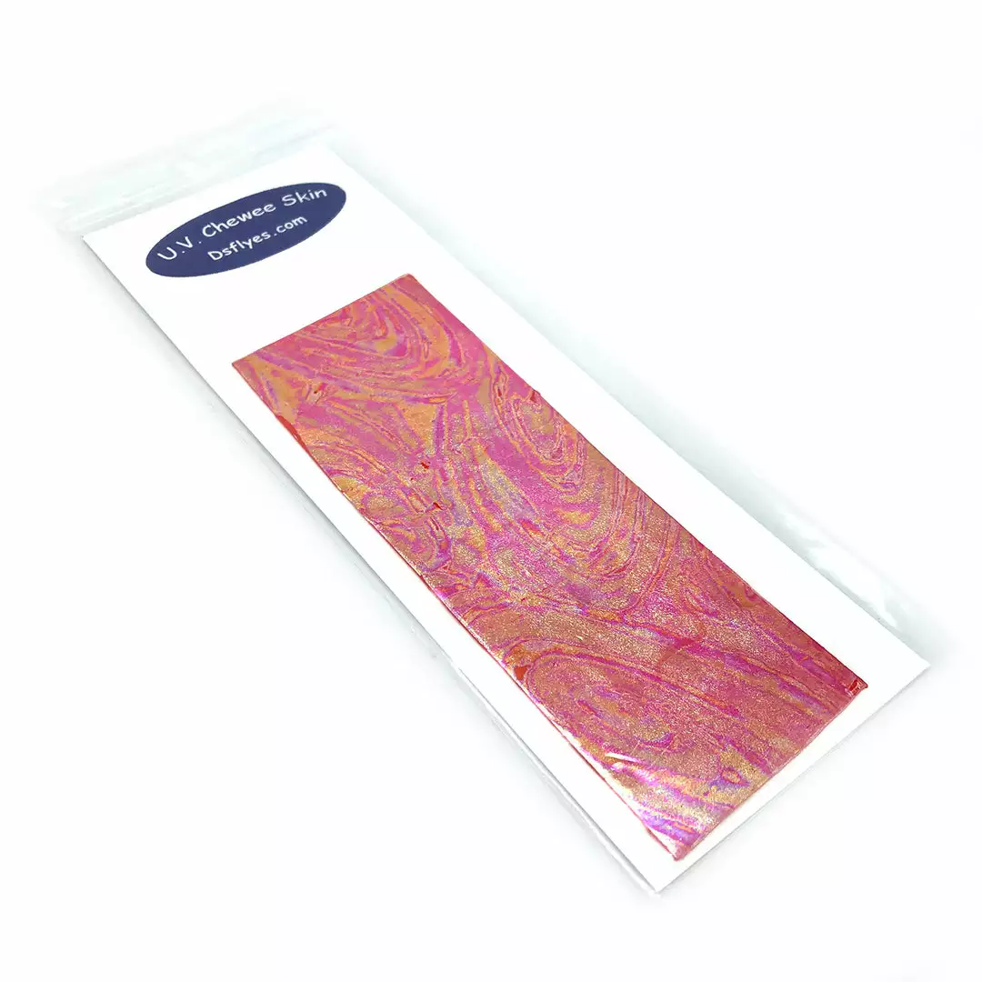 UV Chewee Skin is a pliable material that can be cut and shaped for many fly tying applications. Great for wing cases, bodies, ribs and more. This material wraps easily, has a natural sheen, and since it DOES NOT have an adhesive backing, it is extremely easy to use. The UV reflective qualities of Chewee Skin also make it more visible to trout, salmon, steelhead, and other game fish, even more so than fluorescent materials. UV Chewee skin has a multitude of uses at the fly tying bench and it’s a material that adds that little something that the fish just love. Cut it into strips, wrap it around the hook, and you have an easy and effective worm pattern. The possibilities are endless with this material, so have fun and get creative. Available in 19 fish-attracting UV colors!