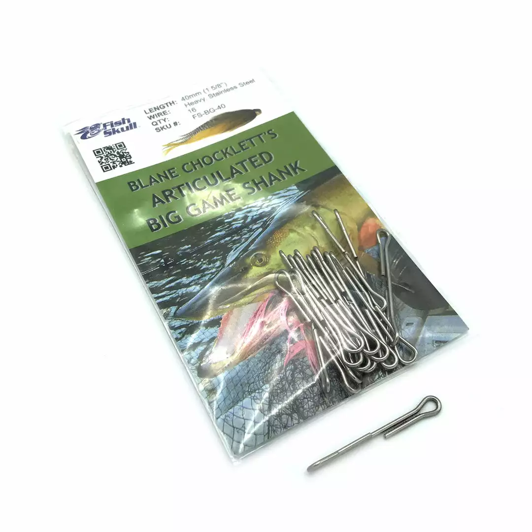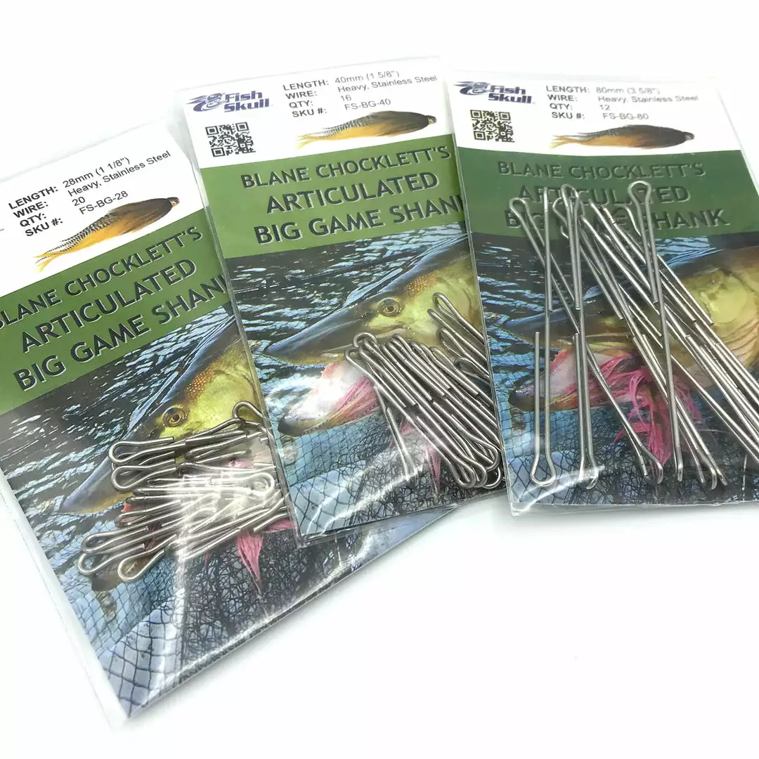 Fish-Skull & Blane Chocklett teamed up to develop the ultimate big game fly tying shank. The Articulated Big Game Shank was designed to meet the demands of large, articulated flies used when targeting river, lake, and saltwater monsters! The Articulated Big Game Shank is optimized for both strength and fly length, allowing you to tie big flies that can hook, hold, and land the largest predatory game fish. When you want the confidence of landing the largest, most aggressive fish like pike, muskie, steelhead, salmon, and toothy saltwater fish, you can’t afford not to have the Fish-Skull Articulated Big Game Shank on the end of your line!