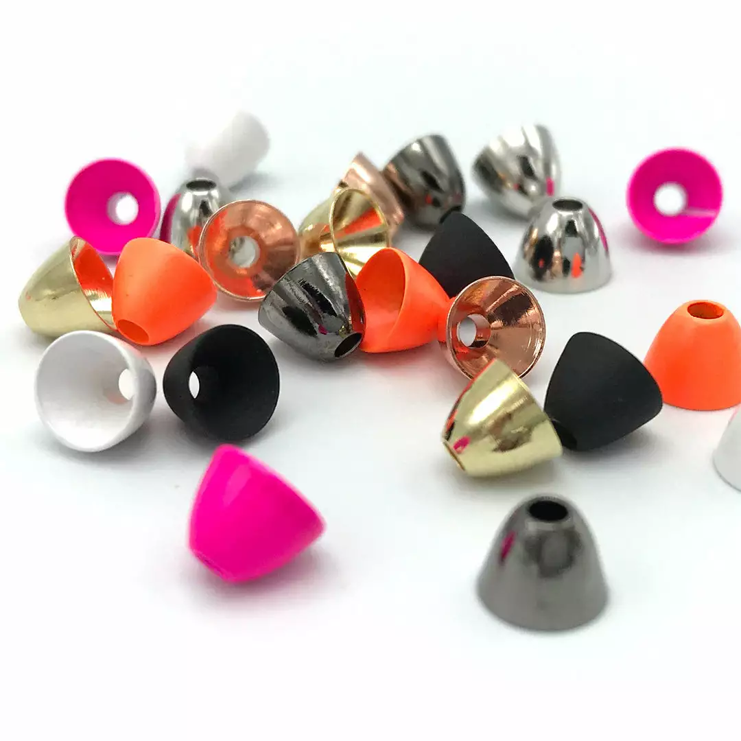 Hareline’s Brass Coneheads are high quality fly tying cones with a beautiful finish. Brass coneheads are ideal for when a cone is preferred over a standard round bead on your wooly buggers and other streamer patterns. They have a slower sink rate than tungsten, allowing your flies to drift in the strike zone longer when fish are feeding up higher. They also put off a greater amount of flash than standard beads, making them a great choice for weighting streamlined wooly buggers, muddler minnows, and other streamer patterns. Available in 4 sizes and 8 fish-attracting colors, Harelines Brass Coneheads are a mainstay at our fly tying bench and we can’t recommend them enough! 24 coneheads per pack.