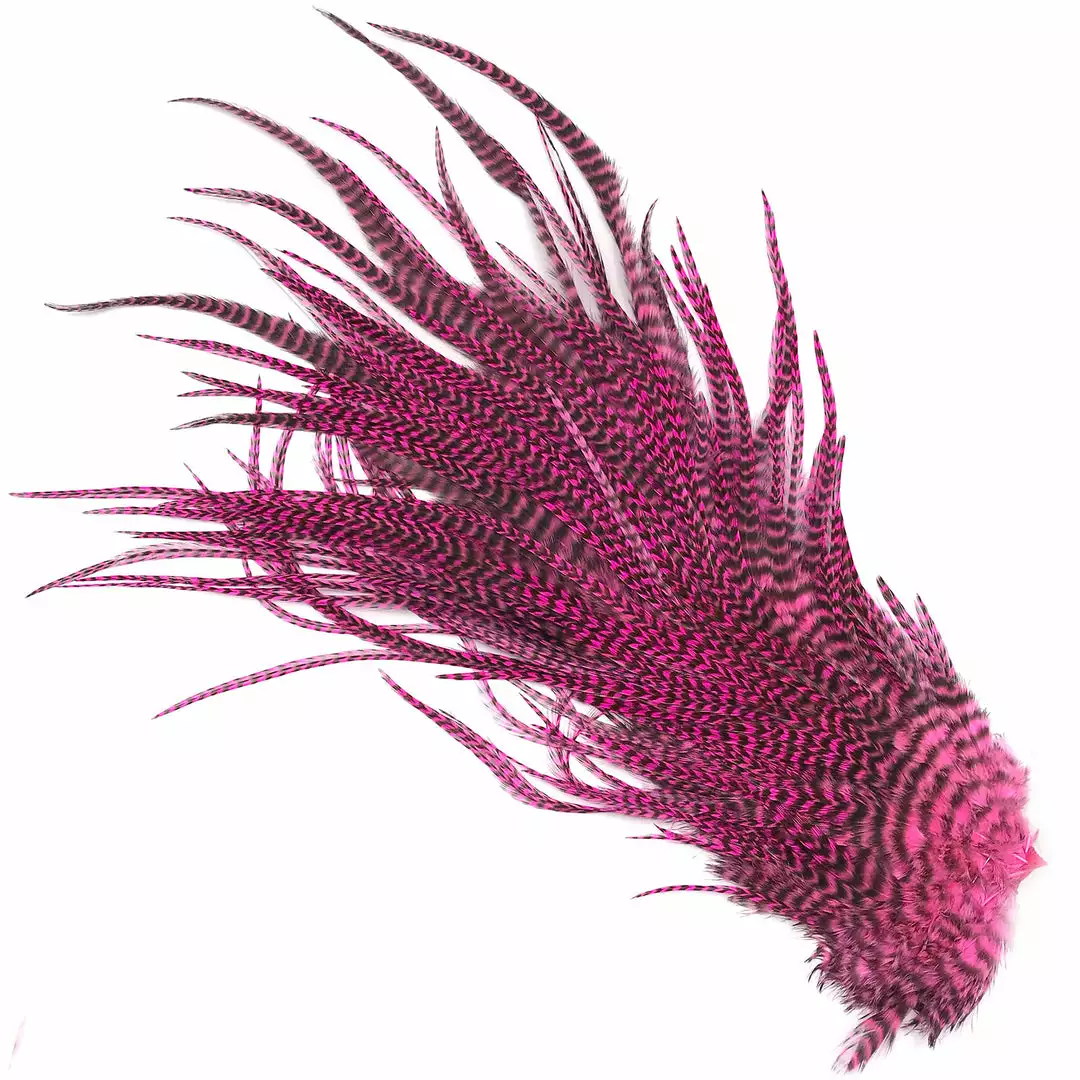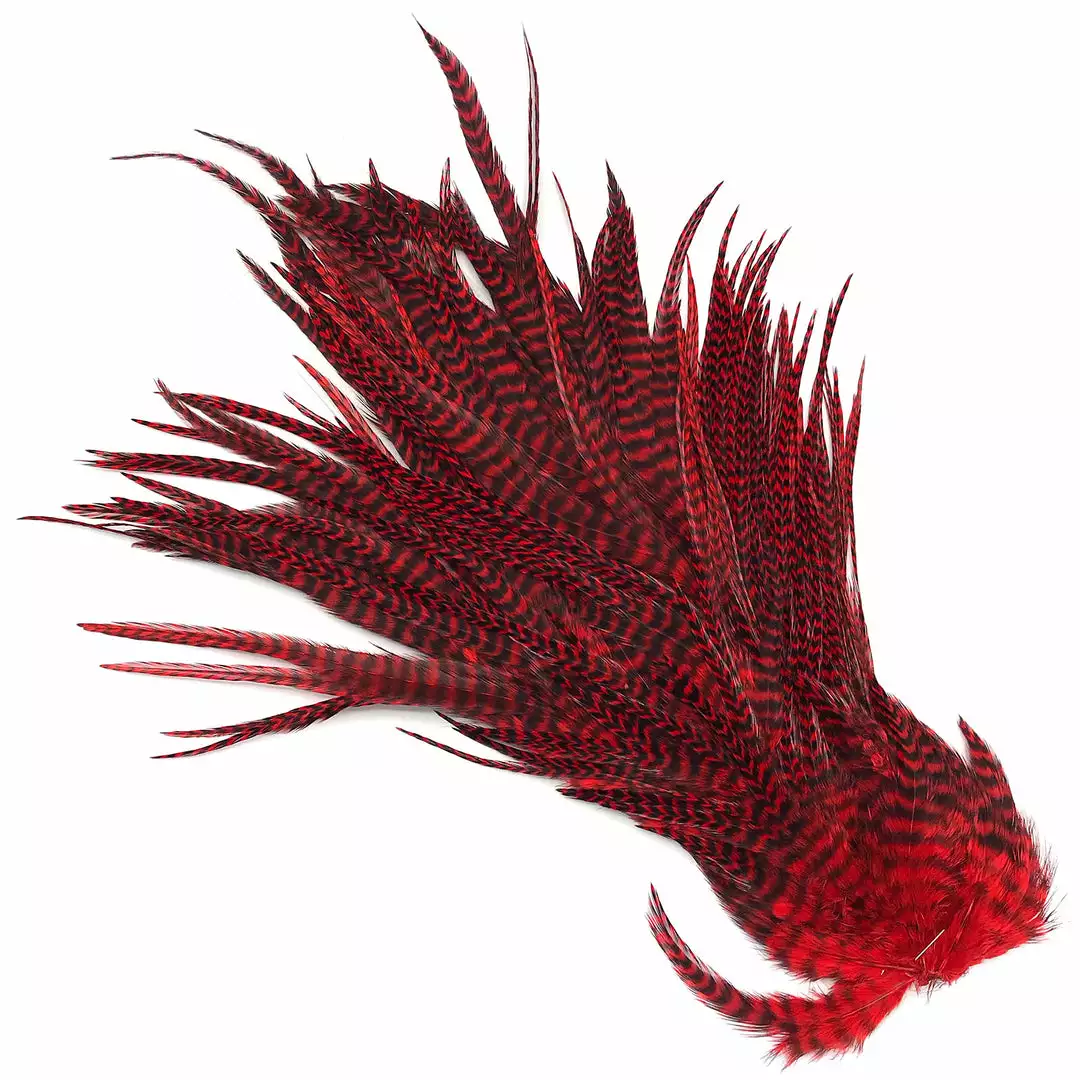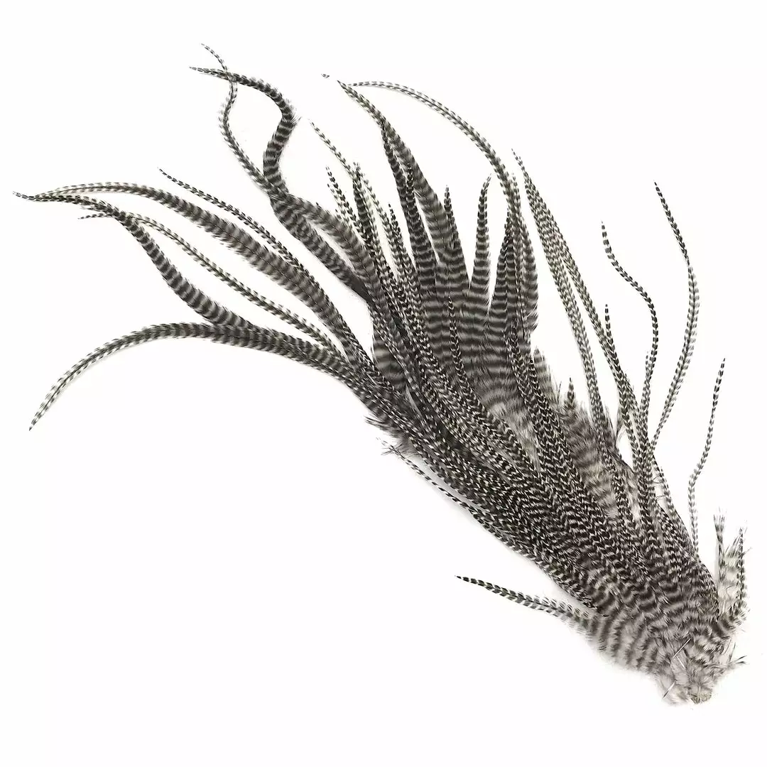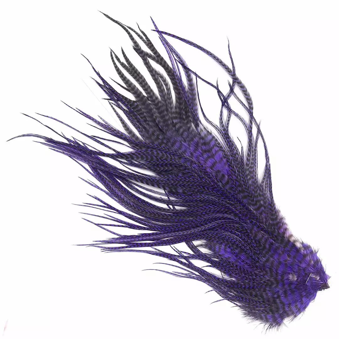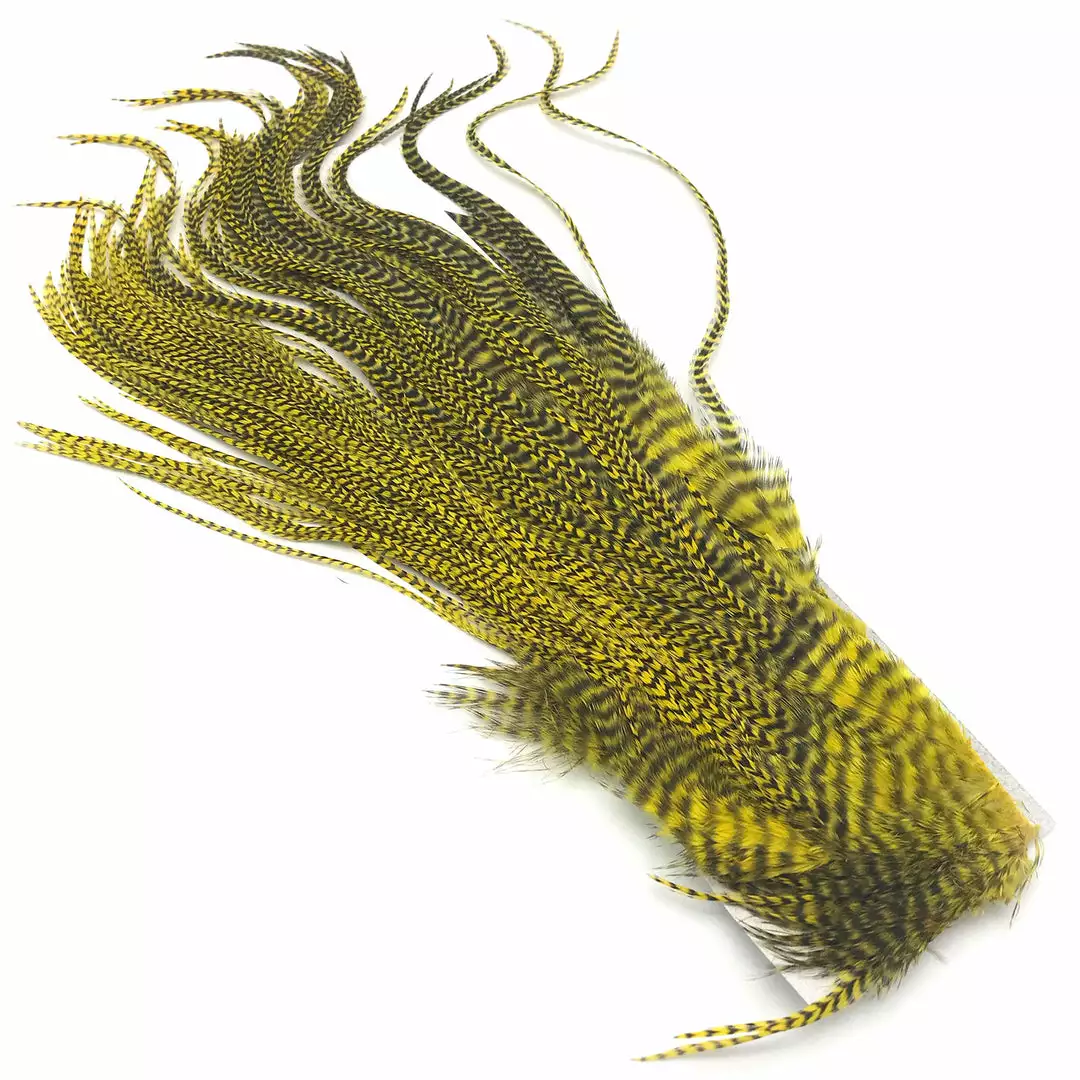 Hareline Half Grizzly Saddles are a nice grade #2 half rooster saddle from Keough with long, narrow hackle feathers. Great for trout, salmon, and steelhead intruder fly patterns. We really like these feathers for big predator-sized streamer flies such as pike, musky, and saltwater tarpon flies. These premium saddles are available in natural and beautifully dyed colors.