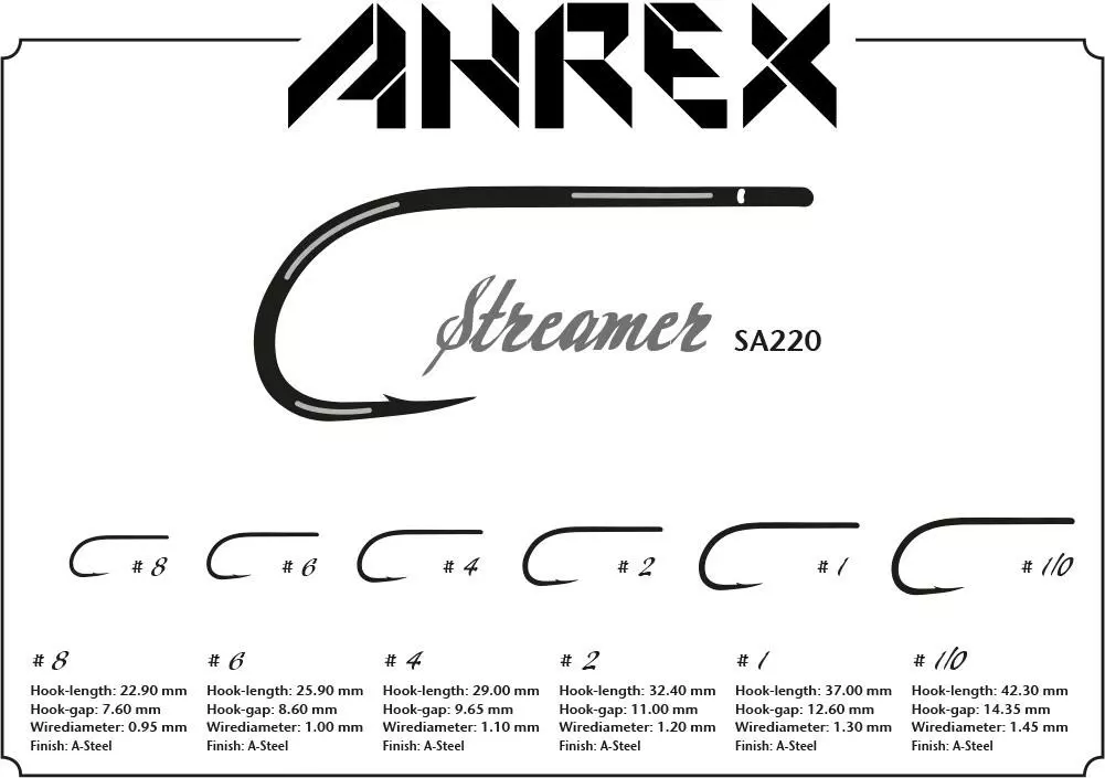The Ahrex SA220 saltwater streamer hook is a straight shank, straight eye streamer hook for saltwater flies. Not as long as a traditional streamer hooks and made with a heavier wire. This hook is an obvious choice for almost any fly, and is a great all-around saltwater hook!Â