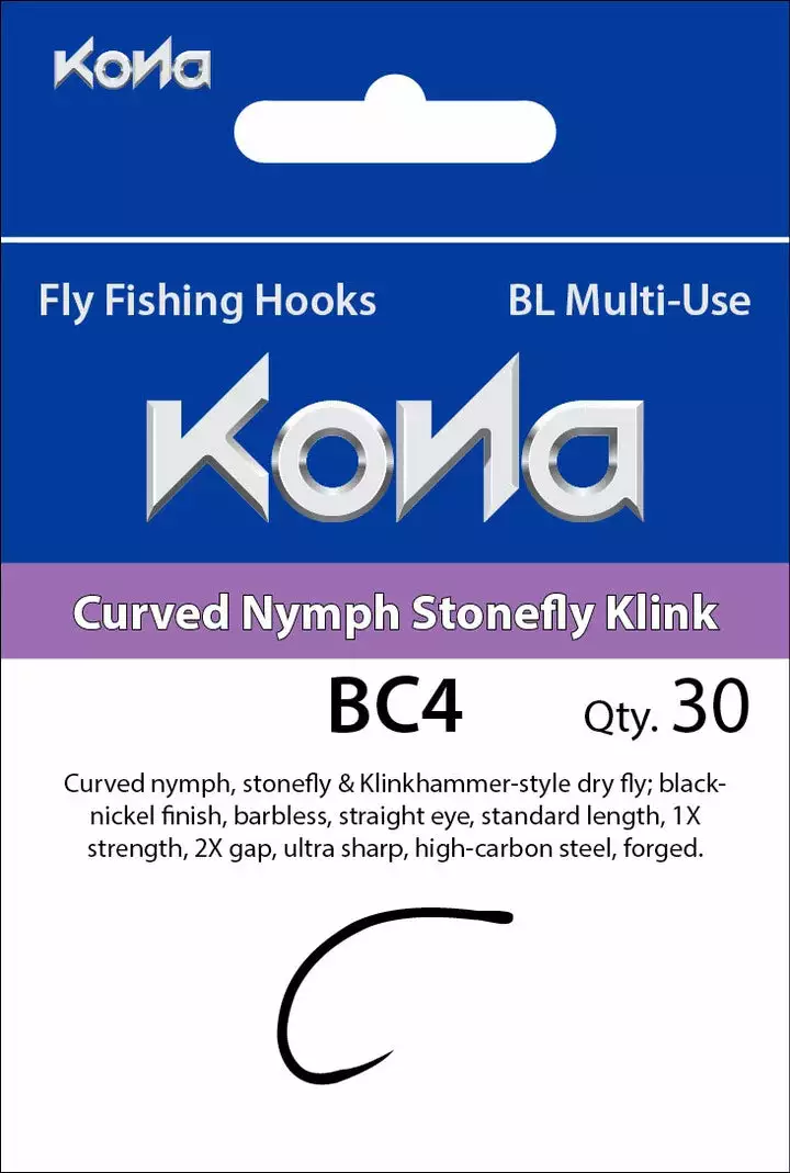 The Kona BC4 hook is perfect for tying curved nymphs and Klinkhammer-style dry flies. This barbless competition-style hook pierces quickly and holds securely due to its ultra-sharp high-carbon steel design and resistant black-nickel finish.