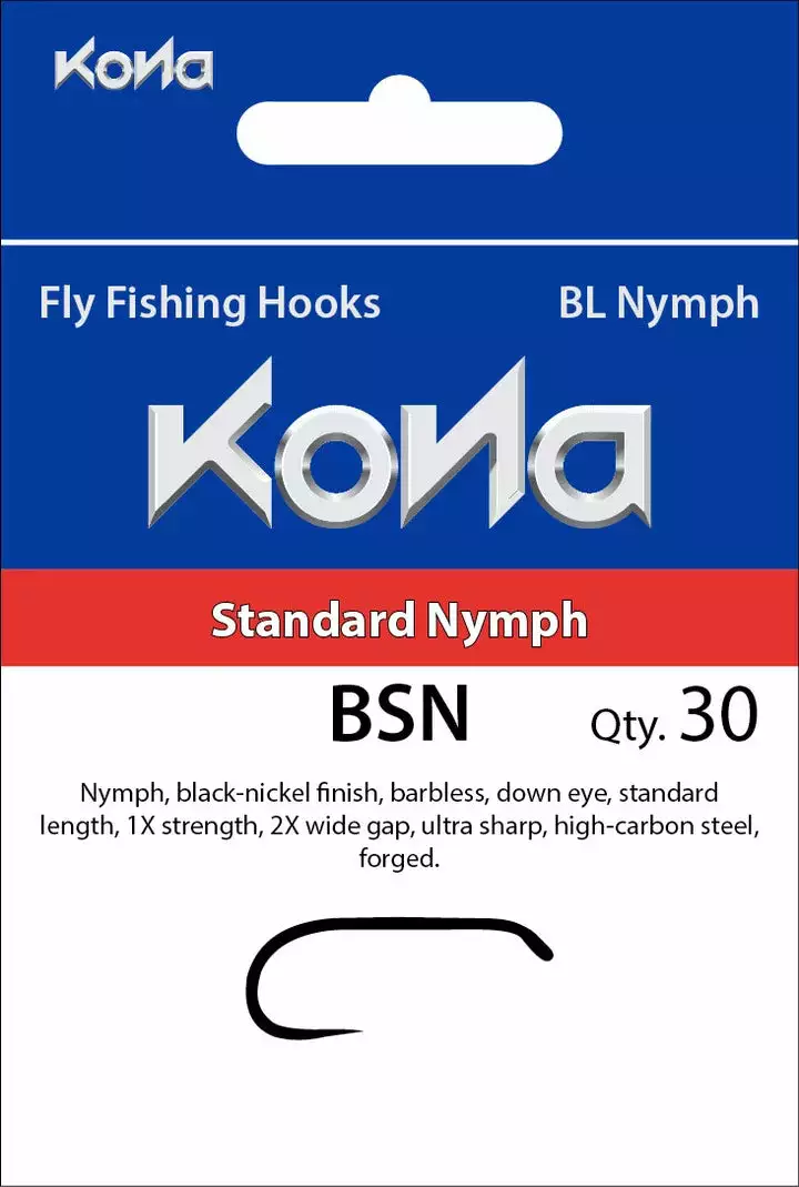 The Kona BSN hook is perfect for tying a wide variety of nymph patterns. This barbless competition-style fly hook pierces quickly and holds securely due to its ultra-sharp high-carbon steel design and resistant black-nickel finish.