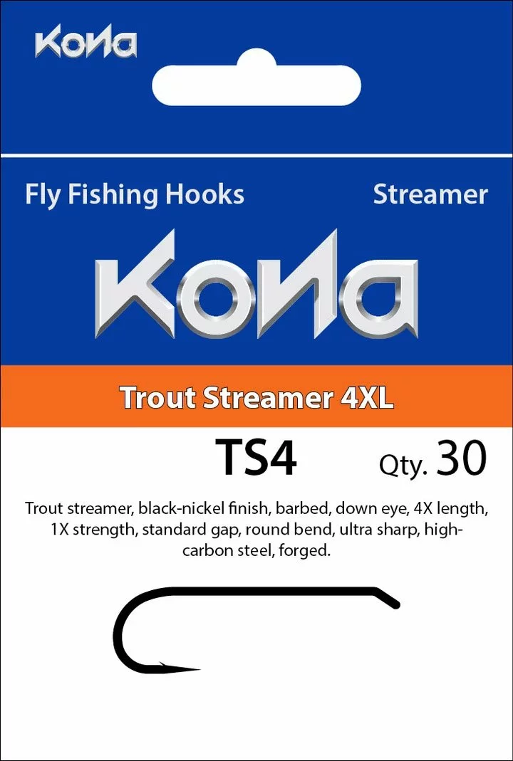 The Kona TS4 hook is perfect for tying woolly buggers, muddlers, trout streamers, and zonkers. Ultra-sharp high-carbon steel and a resistant black-nickel finish give this proven hook style added strength and durability.