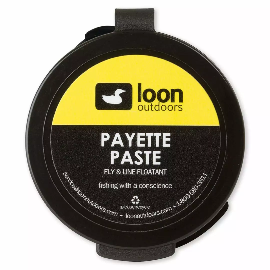 Loon Payette Paste is an excellent floatant designed for fly line, leader, and tippet as well as dry flies. Payette Paste rubs on clear, keeping leader and tippet floating on top. It can also be used as a temporary treatment for damaged floating lines. As a fly floatant, Payette Paste can be applied to large flies, giving wings and bodies a smooth silky coating. It will keep its texture regardless of temperature.