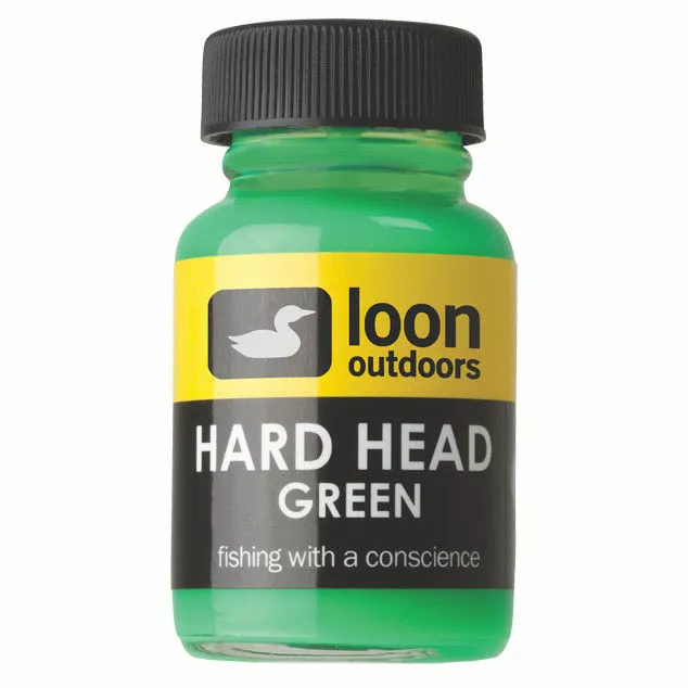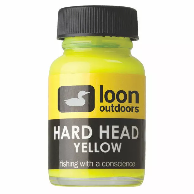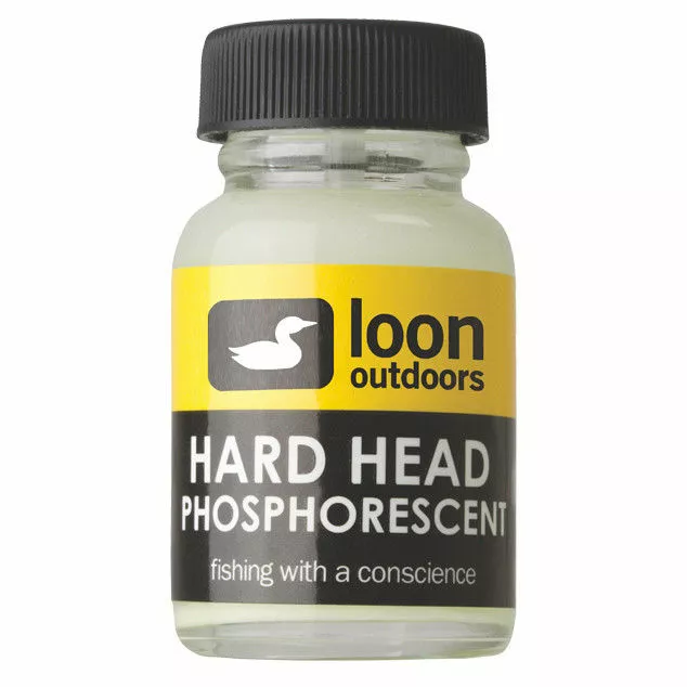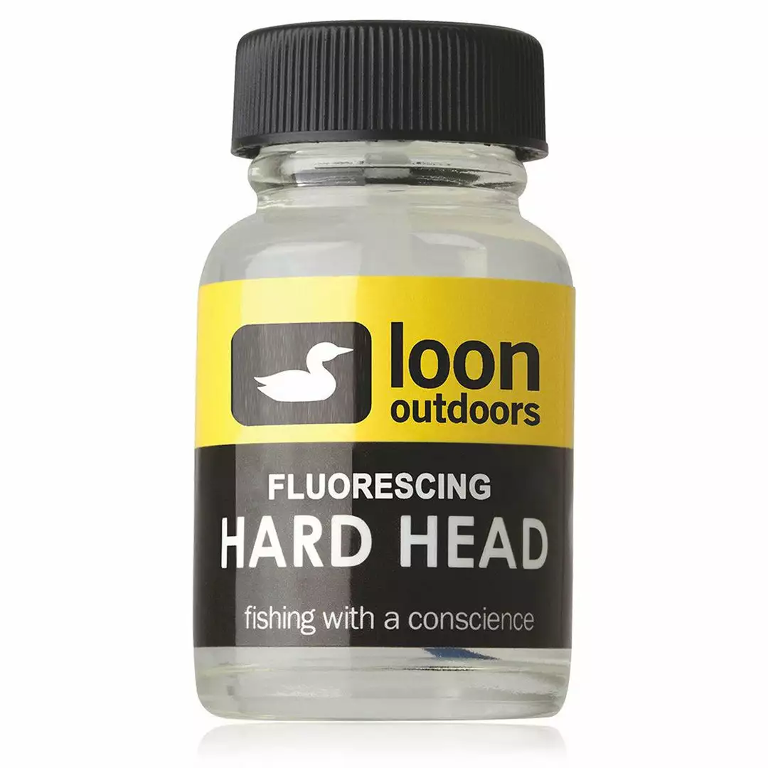 Loon Hard Head is an odorless, non-toxic, thick head cement perfect for building glossy heads and bodies. This fly tying head cement dries hard and glossy. Fluorescing Hard Head performs just like Hard Head Clear, but takes the UV light underwater and reflects it as a color more visible to fish. An extremely popular head cement.