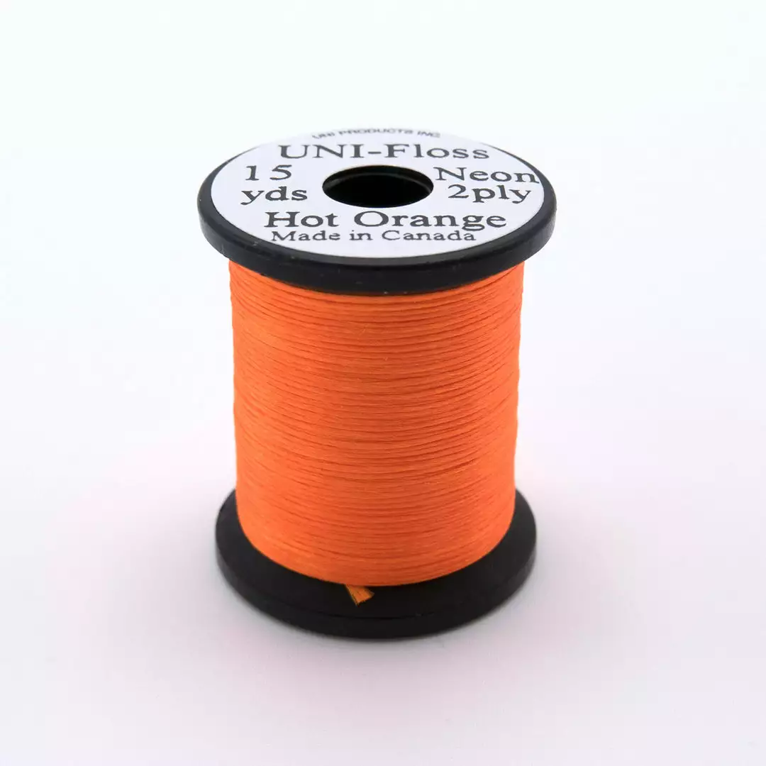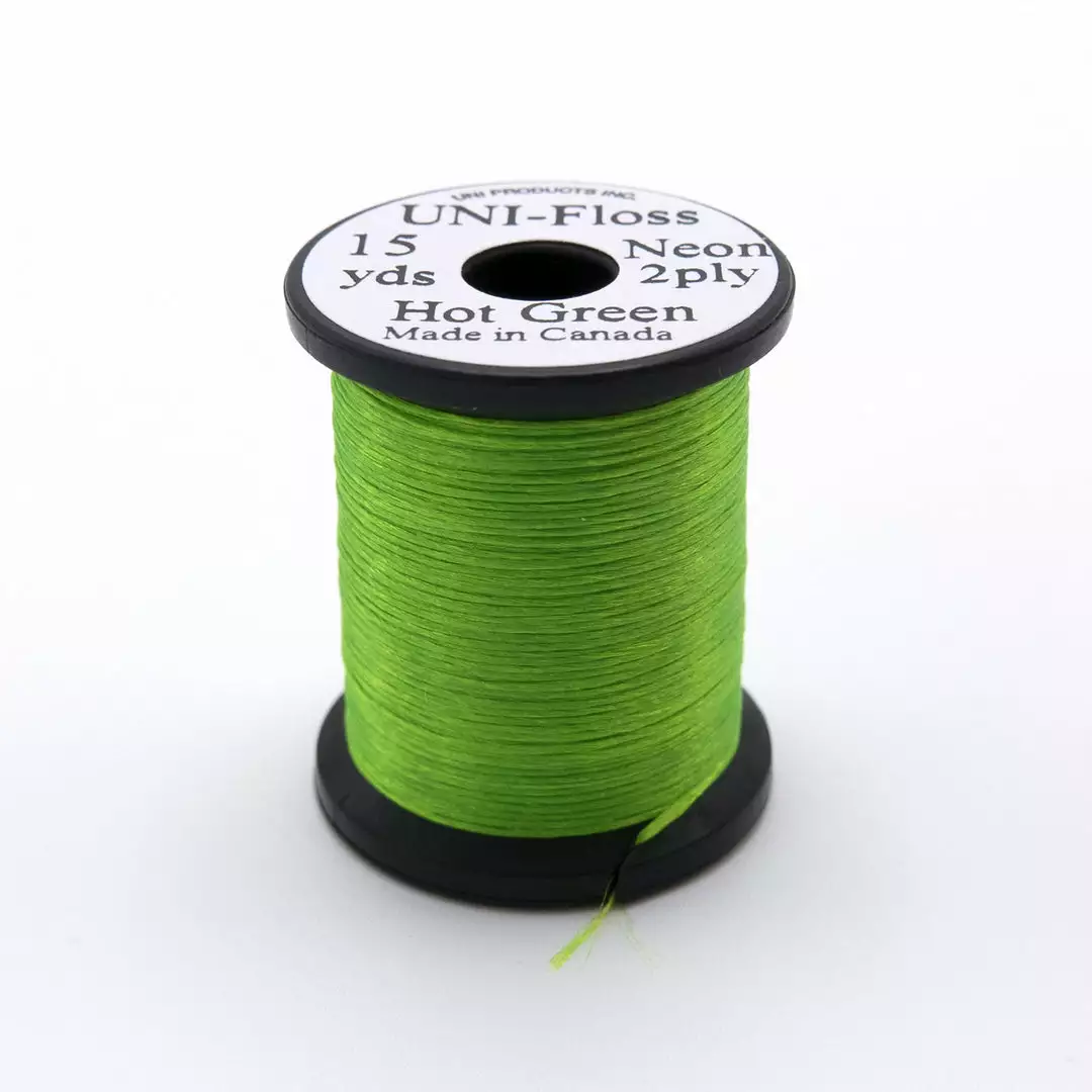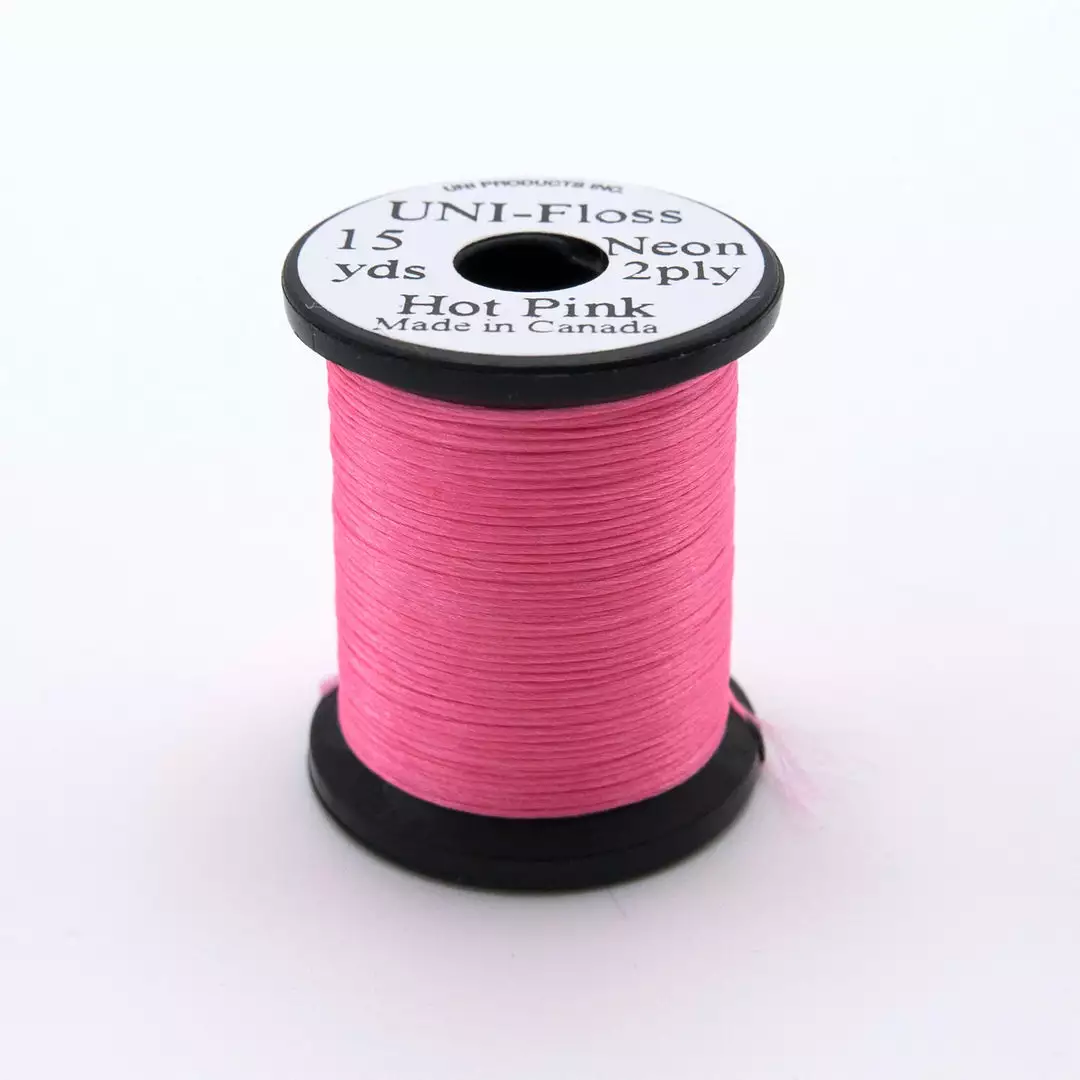 UNI-Floss Neon is a two-ply trilobal floss (similar to Antron) with a radiant sheen. It is the go-to floss for tying salmon flies, streamer bodies, soft hackles, jigs and more. Available in beautifully bright neon colors.